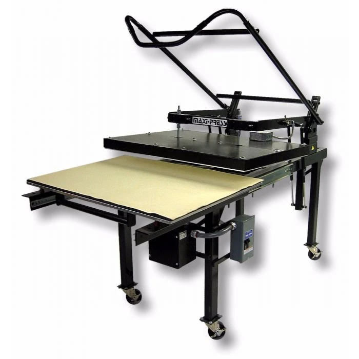 The MAXI•PRESS is a multipurpose large format manual heat transfer press intended for the imprinting of a vast range of different materials. The MAXI•PRESS combines an oversized platen with a low production oriented framework with a single loading table configuration. The gas shock counter springs provide a weightless and effortless operation of the press. The Digital Knight state-of-the-art control system accurately regulates all aspects of the electrical functions of the press, freeing the operator for the main goal of material imprinting.